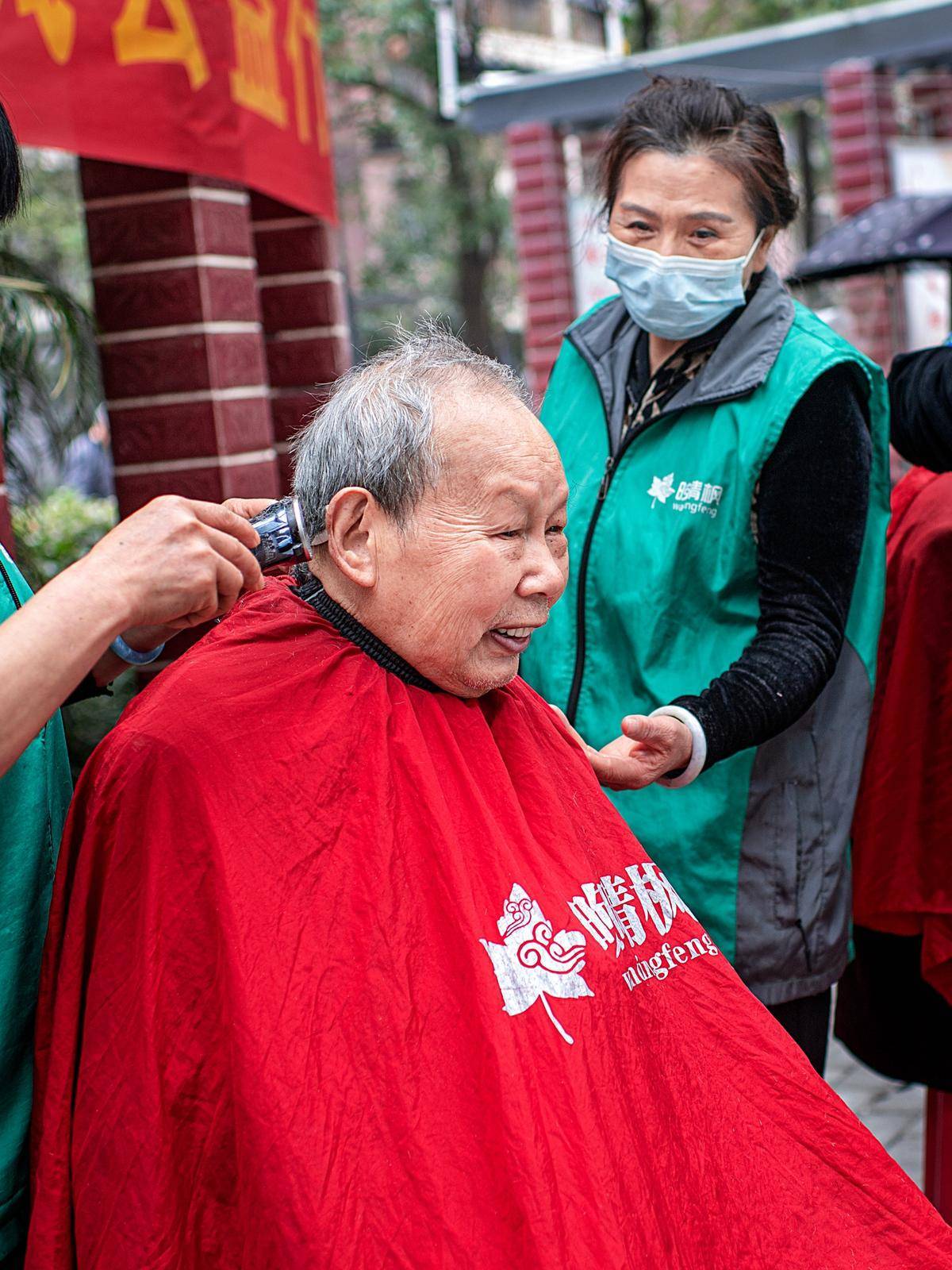 3月16日,在江岸区君安花园举行的公益活动上,照护师为103岁的吴益寿老人理发。(湖北日报全媒记者 朱熙勇 摄)