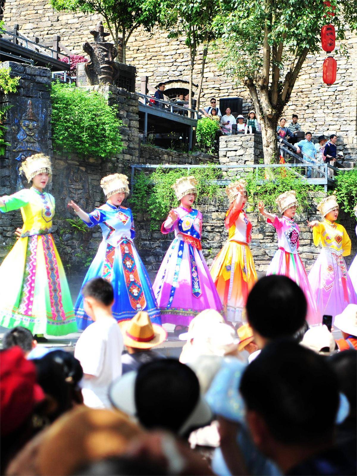 4月14日,游客在宜昌市夷陵区三峡人家风景区的巴王寨观赏山水实景峡江风情歌舞演出。由自然山水景观融合土家民俗风情的原生态、场景式、体验型的大型民俗旅游区,在春日里吸引各地游客纷至沓来,“零距离”欣赏西陵峡谷风光,感受原汁原味的峡江文化。(视界网 张国荣 摄)