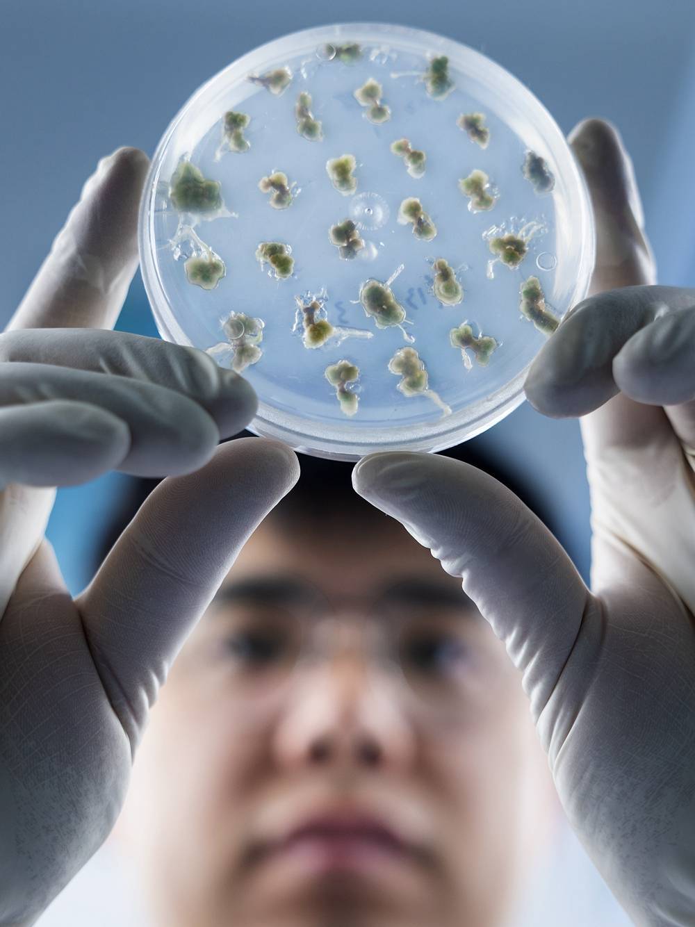 3月19日,油料分子改良方向科研助理张亮在组培生长间内观察油菜愈伤组织生长情况。
