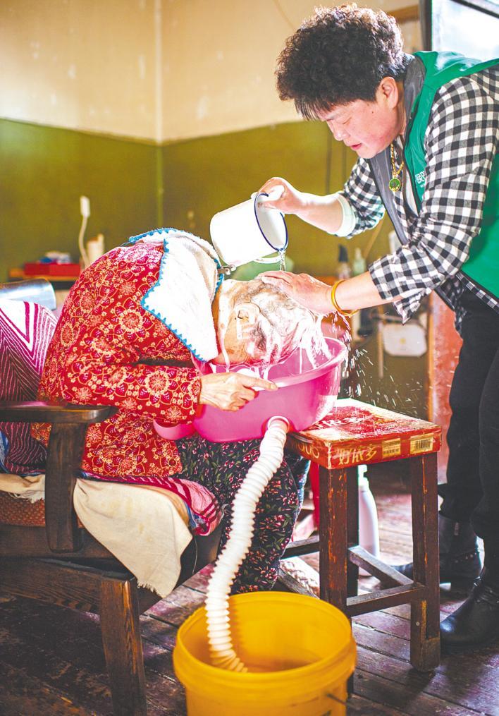 3月12日,照护师朱春华上门帮张慧芬老人洗头理发。(湖北日报全媒记者 朱熙勇 摄)