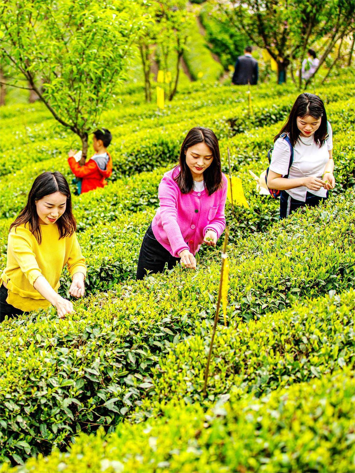 4月13日,竹山县城关镇刘家山村,来自十堰及周边地区的近两千名游客在茶山体验采茶、制茶乐趣。近年来,竹山县持续推进茶旅、文旅、农旅融合发展,不断擦亮“茶香十里·竹山乡遇”茶旅品牌,打造了一批以刘家山、女娲山、大泉山、龙井村等茶山景点的乡村旅游线路和以茶园徒步、茶园骑行、茶园微马等为内容的精品赛事,探索出了一条“绿水青山”转化为“金山银山”全新路径。(视界网 章磊 摄)
