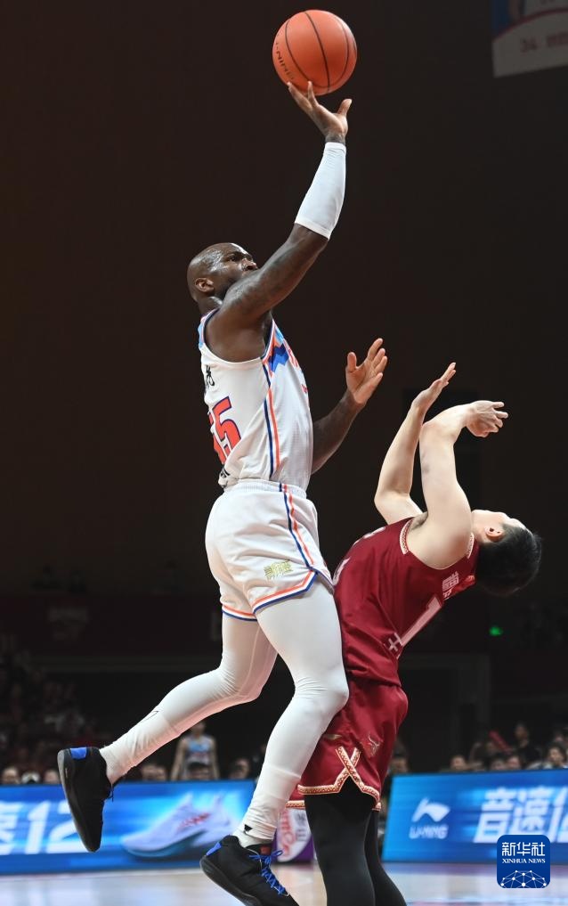 5月9日,新疆伊力特队球员琼斯(左)在比赛中投篮。新华社记者 黄宗治 摄