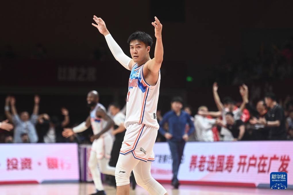 5月9日,新疆伊力特队球员于德豪(右)在比赛中庆祝得分。新华社记者 黄宗治 摄