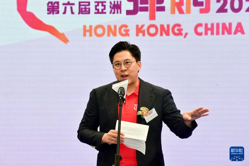 5月10日,中国香港体操总会会长霍启刚在新闻发布会上致辞。新华社记者 卢炳辉 摄