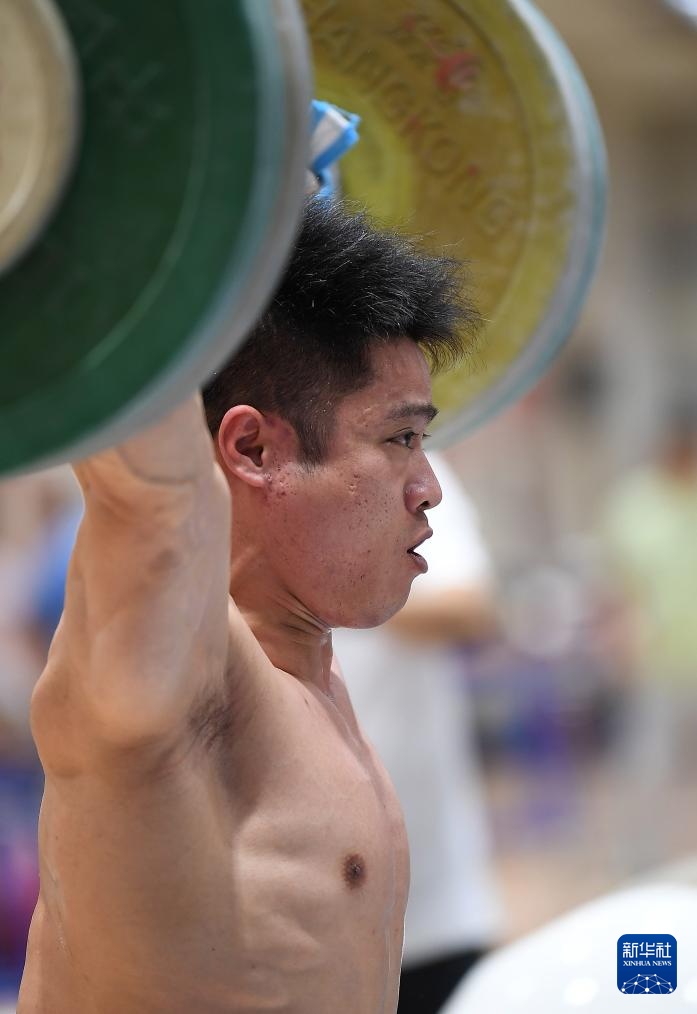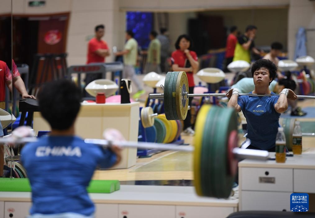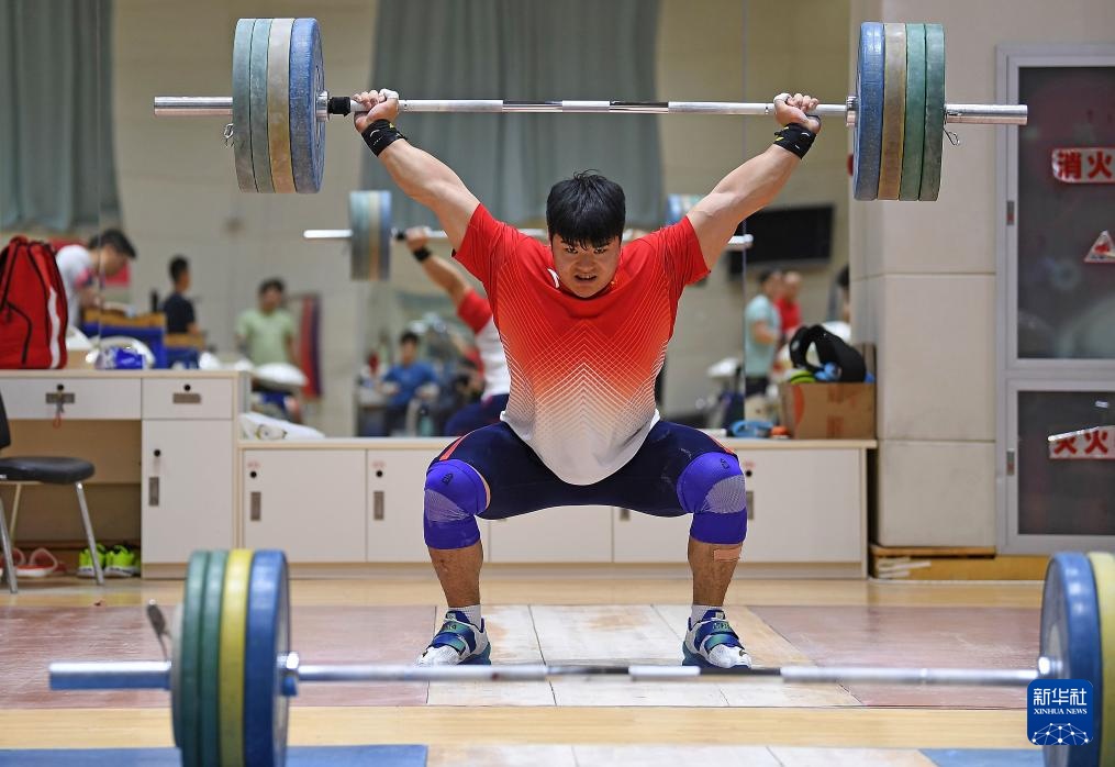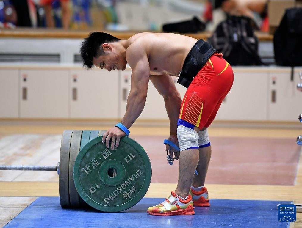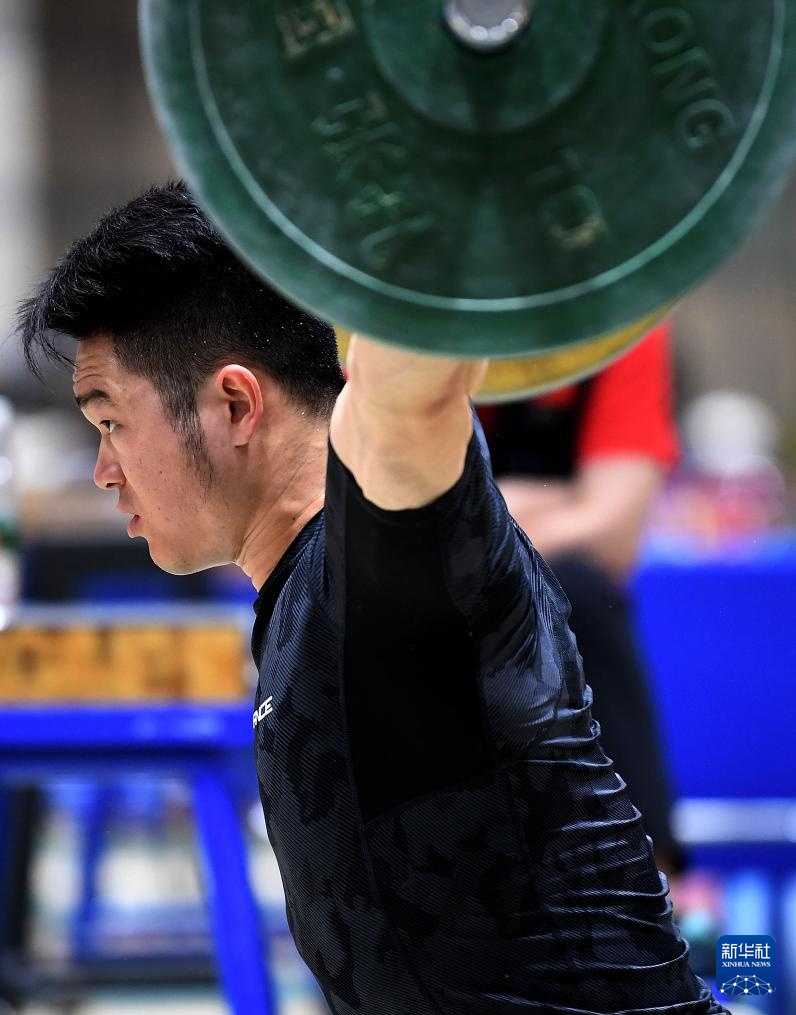 5月10日,国家队选手李发彬在训练中更换杠铃片。新华社记者 侯昭康 摄