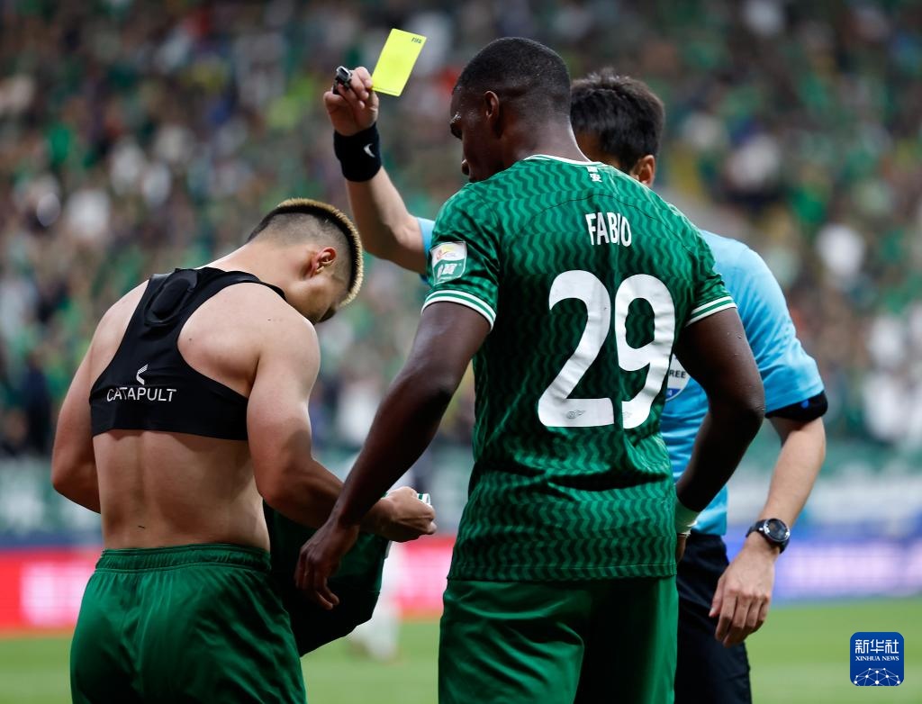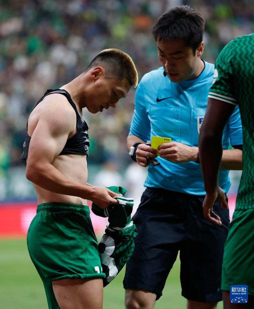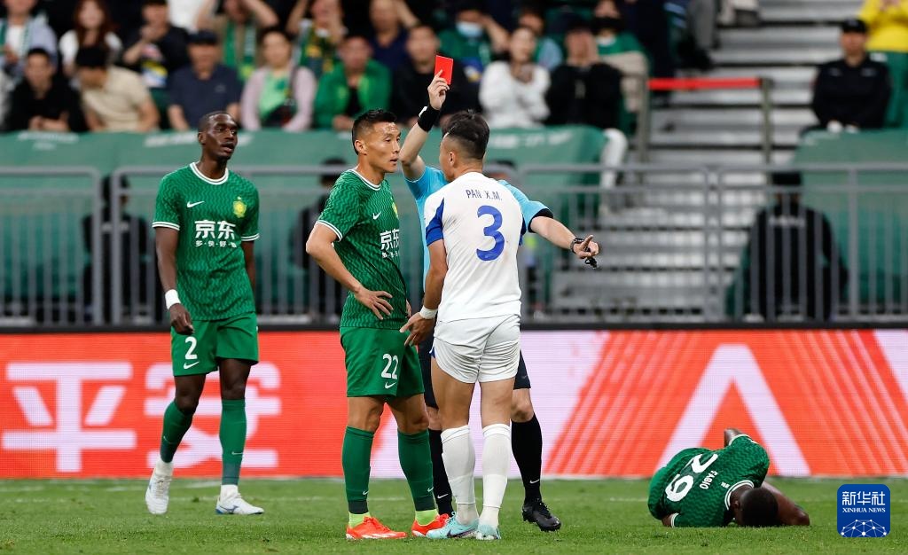 5月11日,主裁判金京元向脱衣庆祝进球的北京国安队球员方昊(左)出示黄牌。新华社记者 王丽莉 摄
