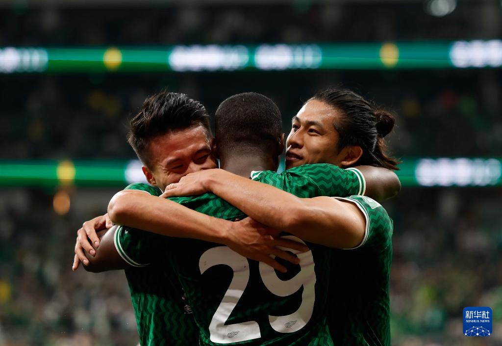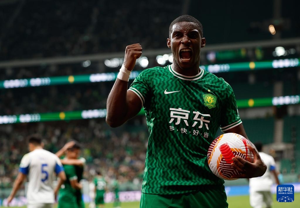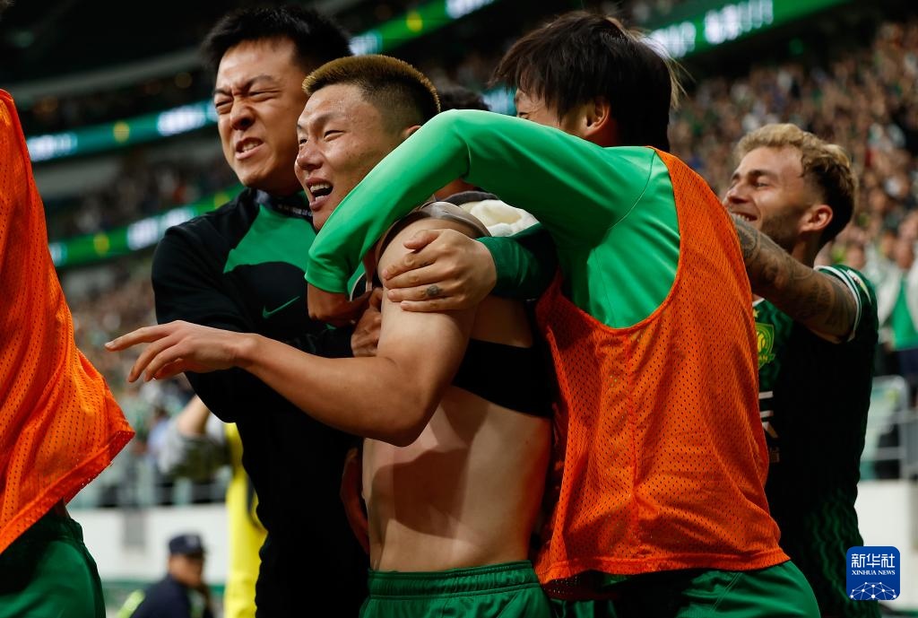 5月11日,北京国安队球员林良铭(左)在比赛中进球后庆祝。新华社记者 许雅楠 摄