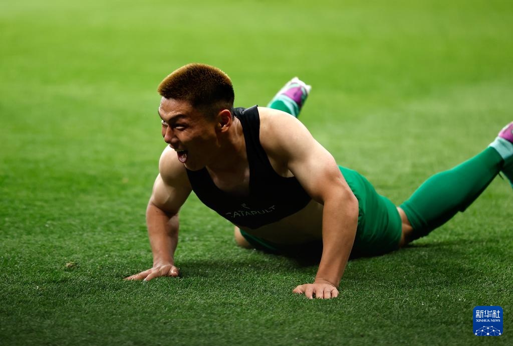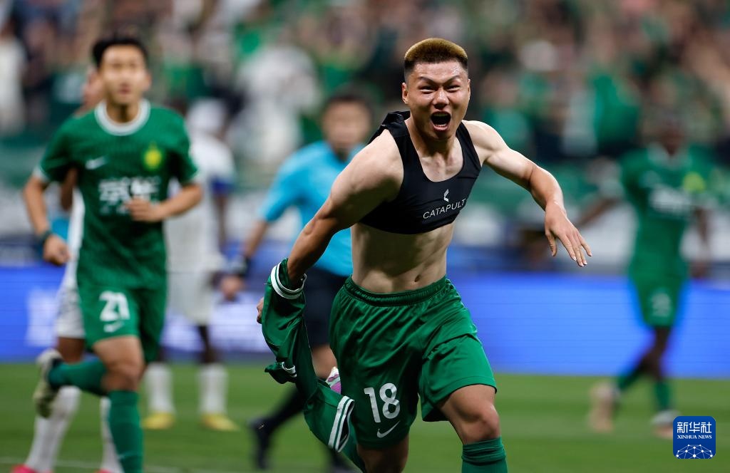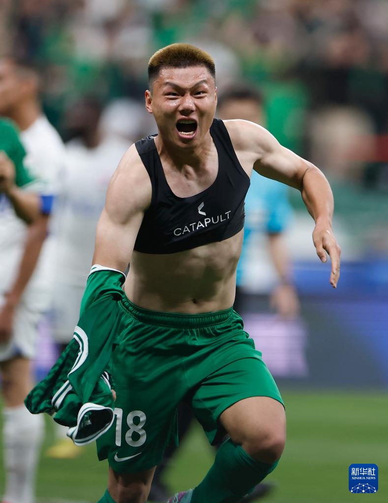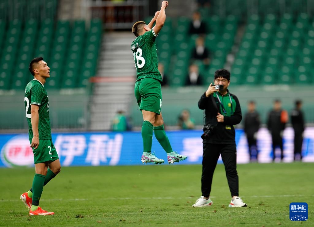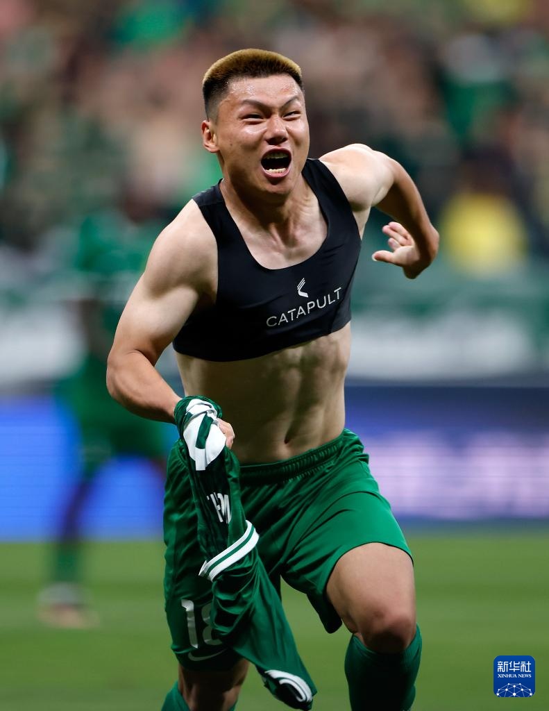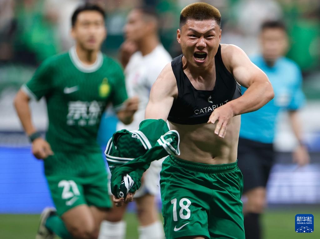 5月11日,北京国安队球员方昊庆祝自己的进球,这是球队逆转取胜的第三粒进球。新华社记者 王丽莉 摄