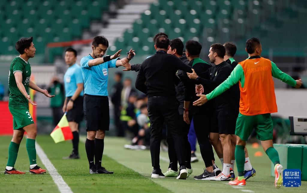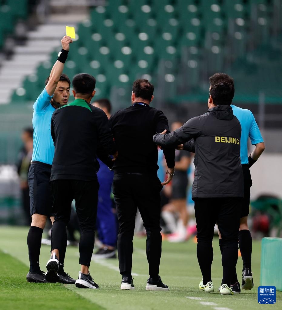 5月11日,主裁判金京元在比赛中向北京国安队主教练里卡多·苏亚雷斯(右三)出示黄牌。新华社记者 王丽莉 摄