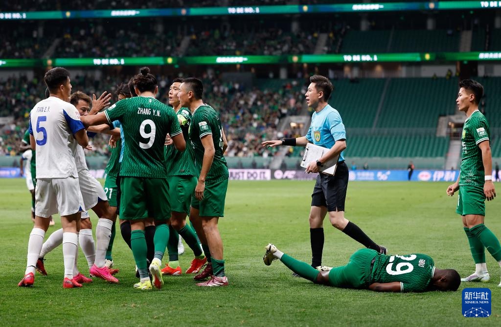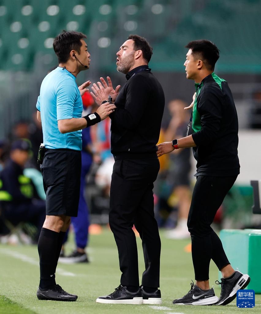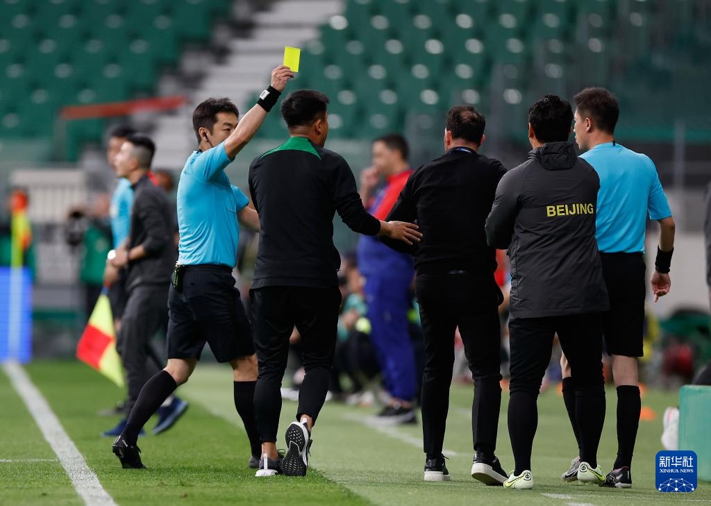 5月11日,主裁判金京元(左二)在比赛中向北京国安队主教练里卡多·苏亚雷斯出示黄牌后。新华社记者 王丽莉 摄