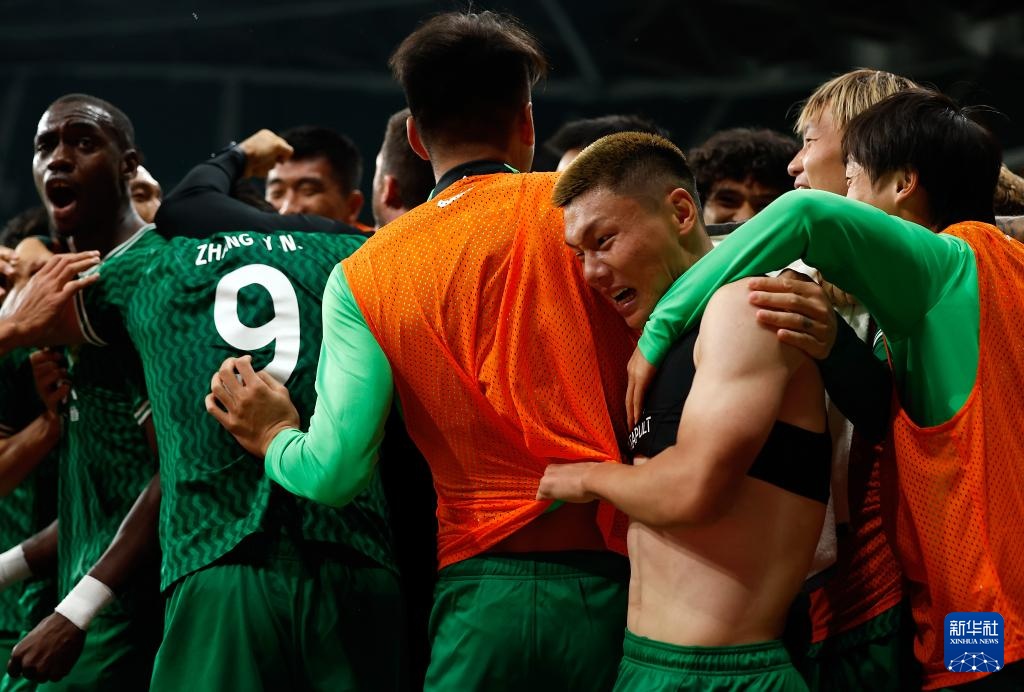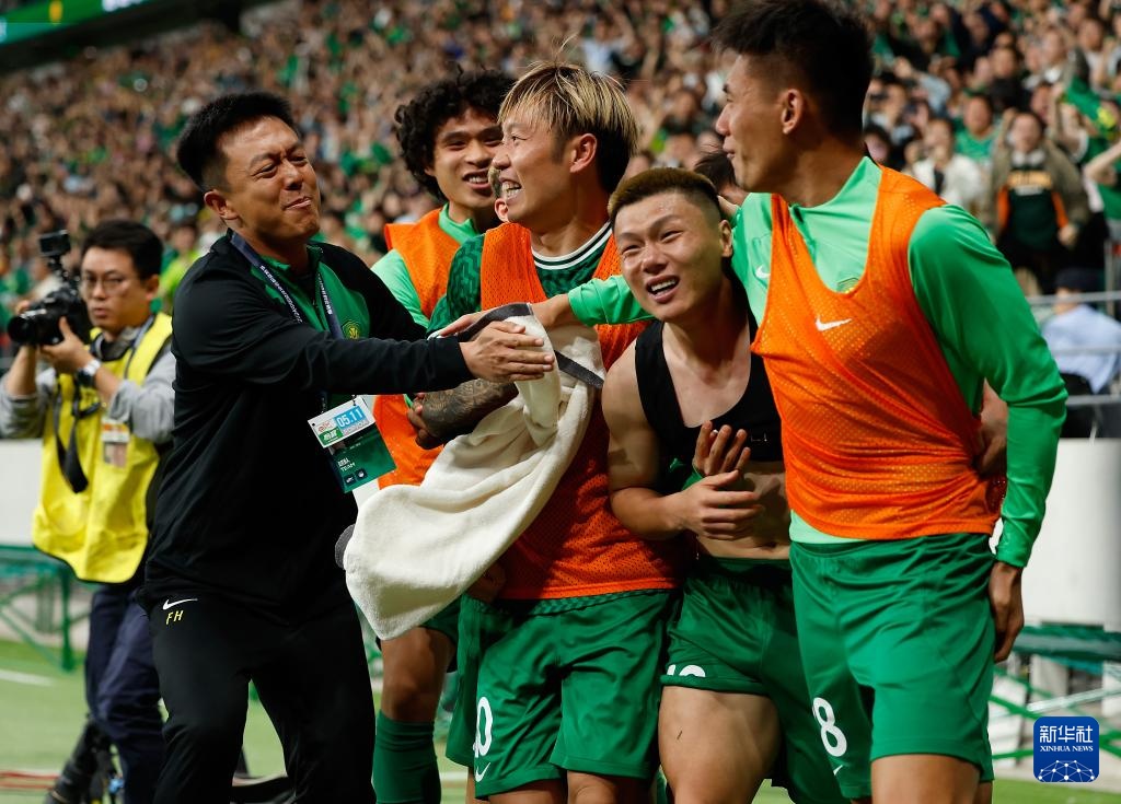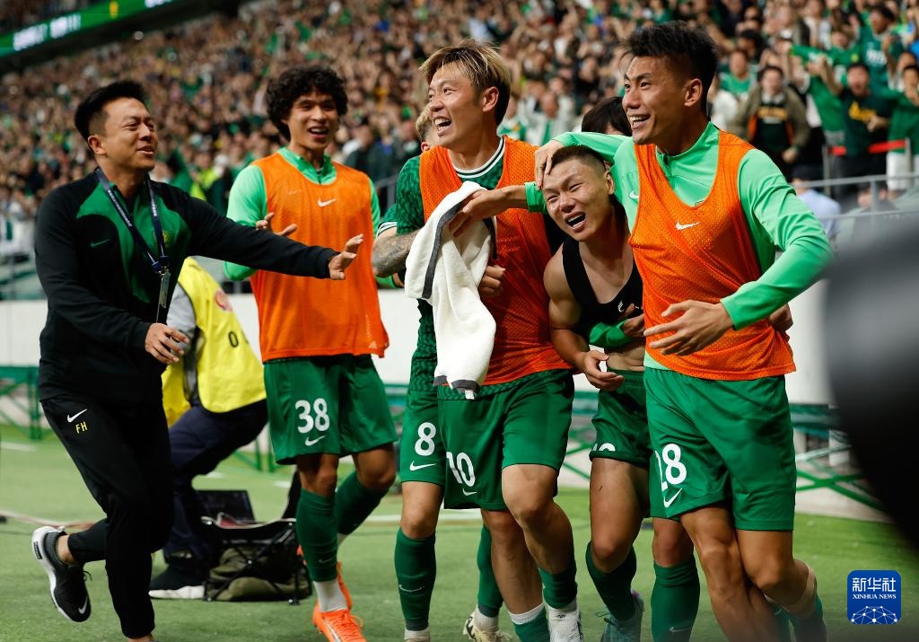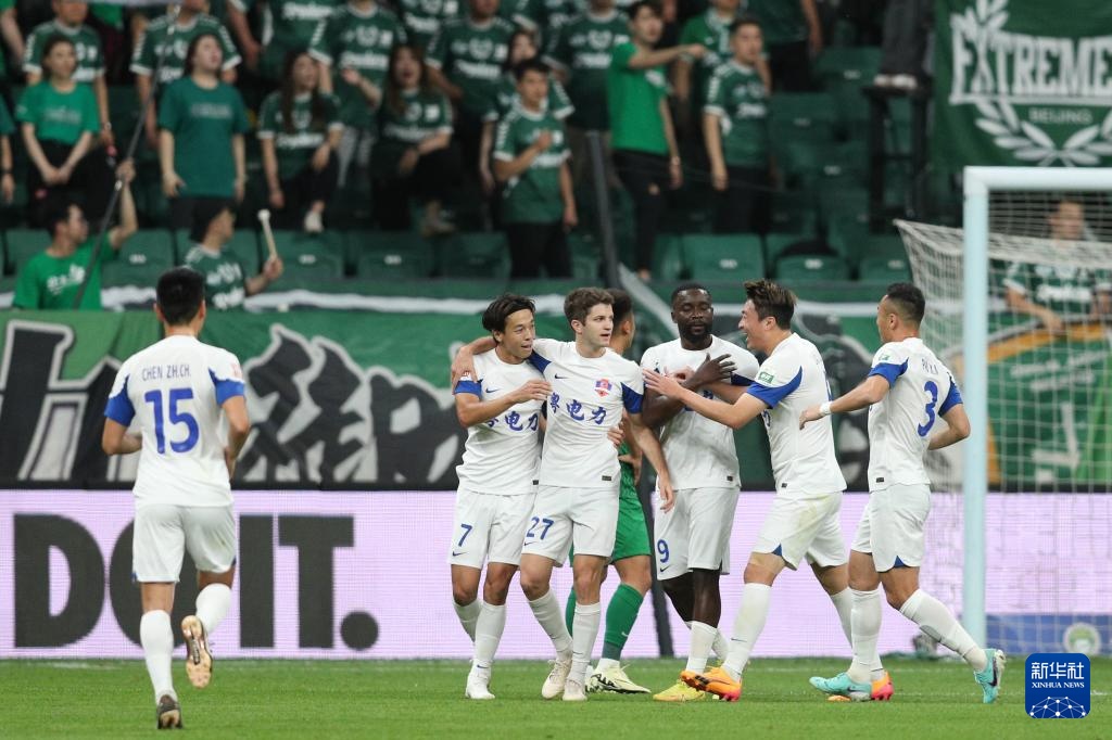 5月11日,北京国安队成员庆祝球员方昊(左二)的进球,这是球队逆转取胜的第三粒进球。新华社记者 王丽莉 摄