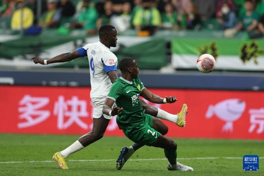 5月11日,北京国安队球员马马杜(右)与梅州客家队球员鲁尼在比赛中拼抢。新华社记者 许雅楠 摄