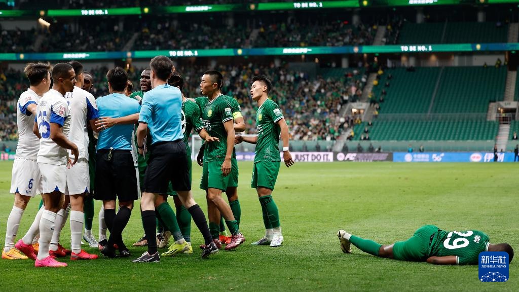 5月11日,北京国安队球员法比奥(下)在比赛中拼抢倒地,随后双方球员发生争执。新华社记者 王丽莉 摄