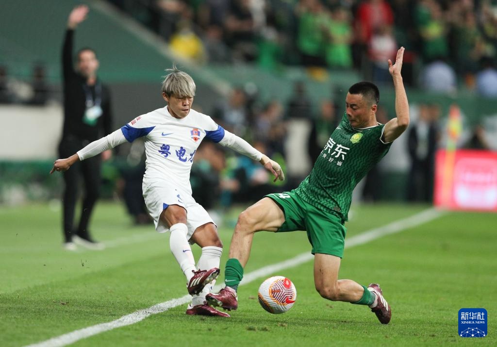 5月11日,北京国安队球员李磊(右)与梅州客家队球员茹子楠在比赛中拼抢。新华社记者 许雅楠 摄