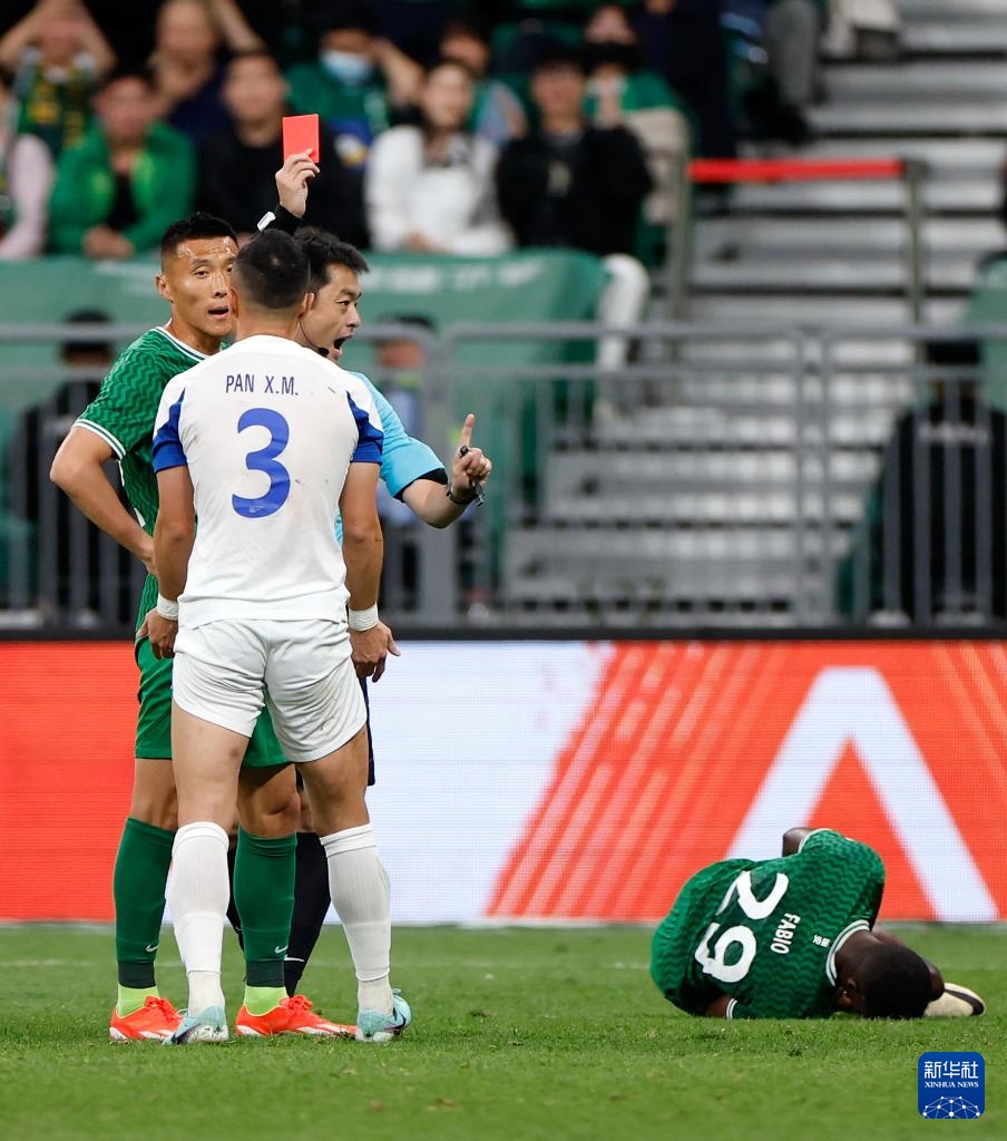 5月11日,主裁判金京元在比赛中向梅州客家队球员潘喜明(左一)出示红牌。新华社记者 许雅楠 摄