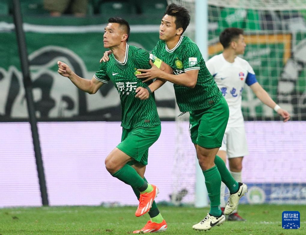 5月11日,北京国安队球员于大宝(左)在比赛中进球后庆祝。新华社记者 许雅楠 摄