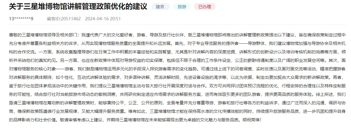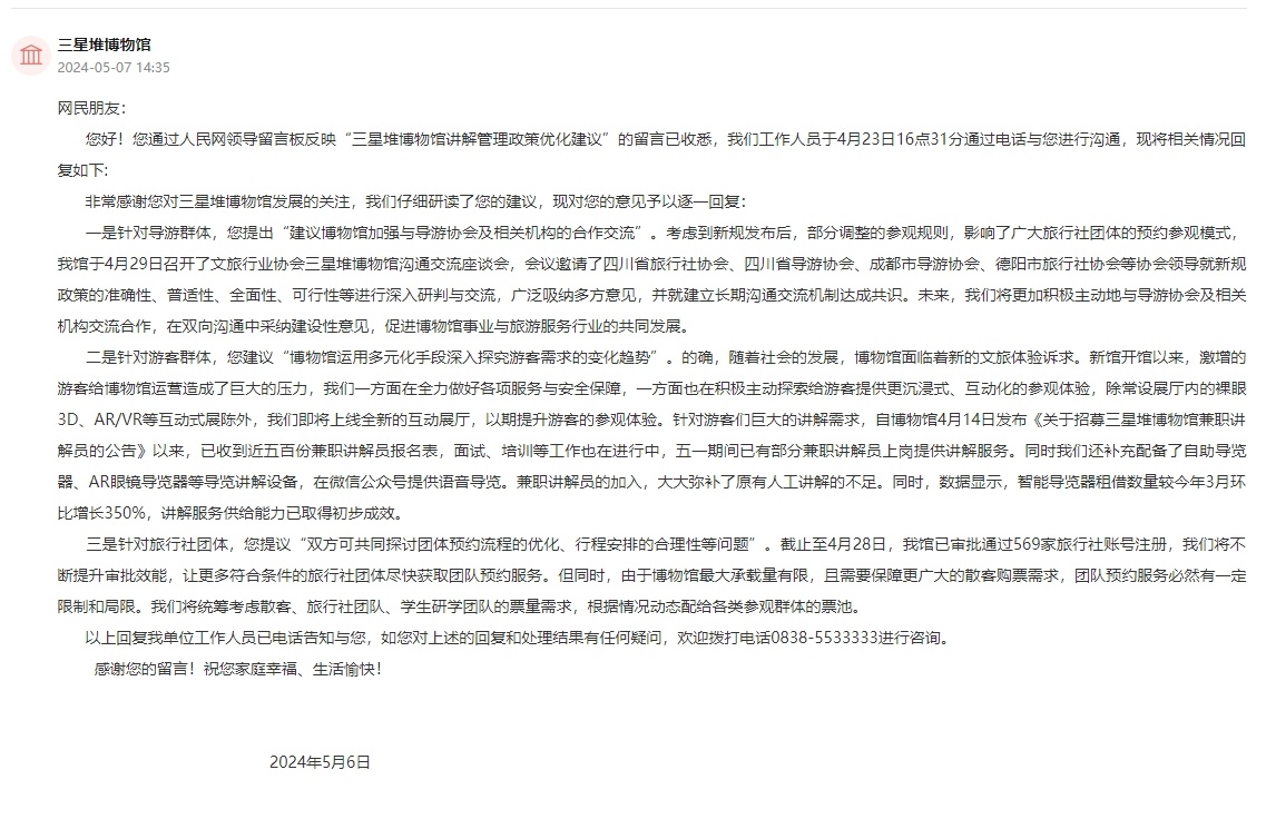 人民网成都5月12日电 (罗昱)近日,有网友在人民网“领导留言板”留言,就三星堆博物馆讲解管理新政策提出建议,包括加强与导游协会及相关机构的合作交流、运用多元化的手段深入探究游客需求的变化趋势、主动与各大旅行社开展深度对话与合作等等。对此,三星堆博物馆进行了仔细研读,然后逐一进行了回复。