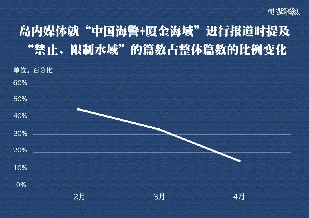 这是岛内媒体就“中国海警+厦金海域”进行报道时,提及“禁止、限制水域”的报道占整体篇数的比例变化,可以看到,中国海警的执法巡查,也让岛内媒体变得“知趣”起来——开始不再提这个词。