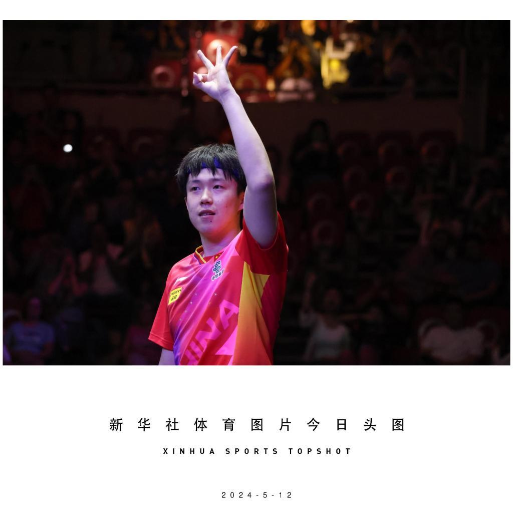 5月11日,王楚钦在夺冠后伸手比出“3”的手势,庆祝收获个人本届赛事上的第三冠。新华社记者 王海洲 摄