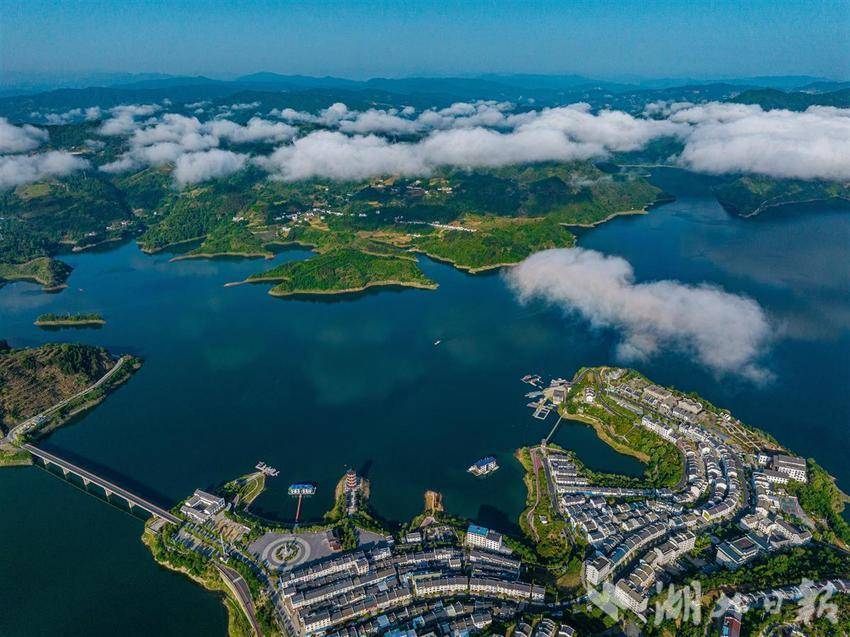 5月13日拍摄的竹山县上庸镇圣水湖,云雾缭绕,美丽如画(无人机照片)。近年来,竹山县上庸镇着力打造旅游全省名镇,注重生态绿色环保建设和经济协调发展,以“青山、绿水”做实、做强、做大旅游产业,圣水湖成功创建国家湿地公园,上庸古镇获评全国生态旅游示范镇、湖北省旅游名镇。