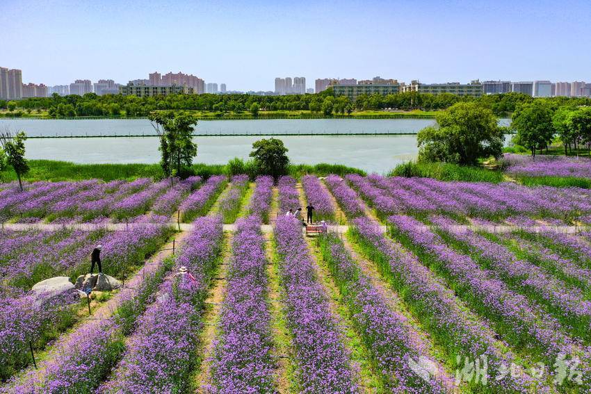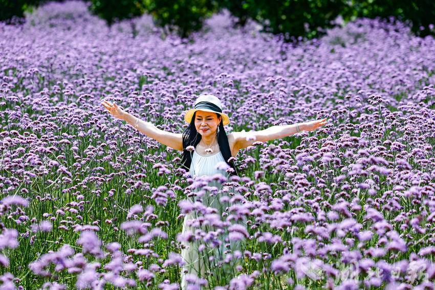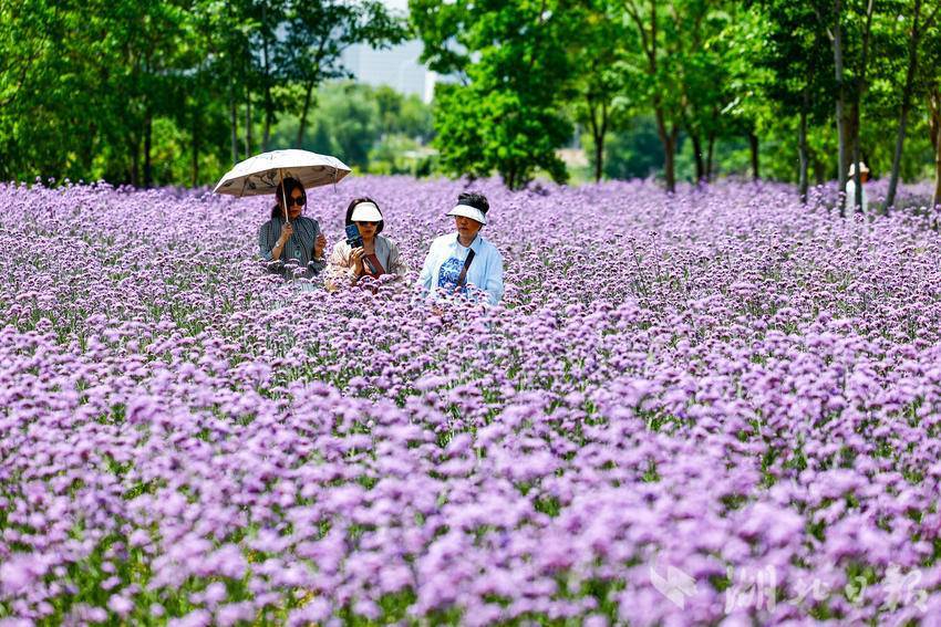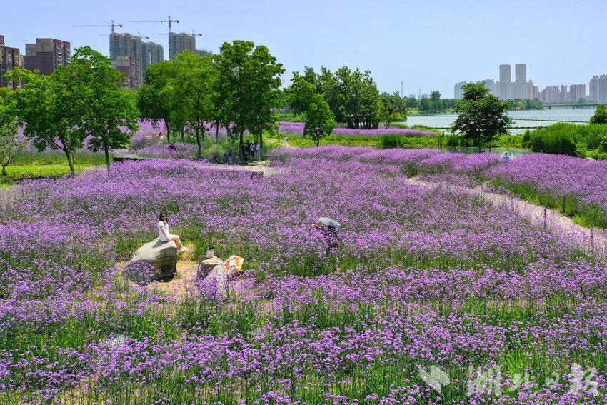 2024年5月14日,在武汉市东西湖区径河公园,超8万平方米的柳叶马鞭草进入盛花期,迎来最佳观赏期,市民游客穿行于紫色花海之中,拍照打卡。