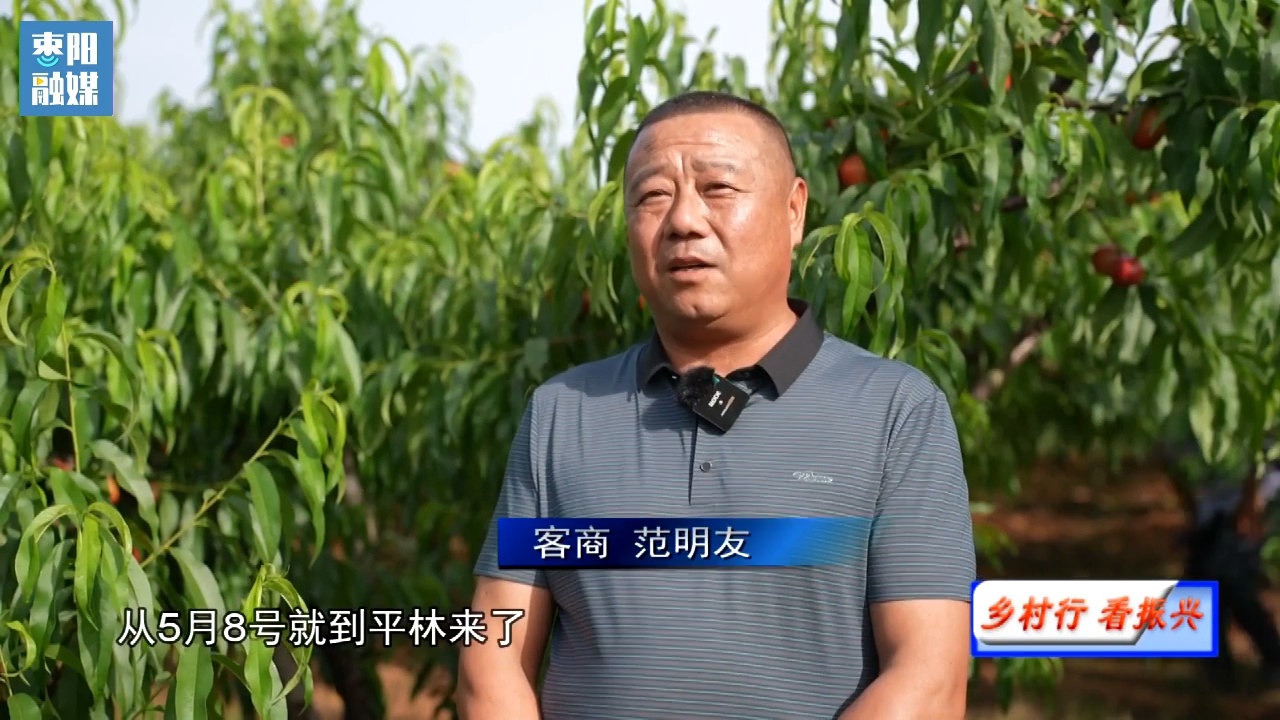 客商范明友:从5月8号就到平林来了,我到处走了一下,很多地方都是品质很好。我今年对平林油桃品质很有信心,要保证货源,我提前要包园,因为我每年销往广东广西要100万斤左右。