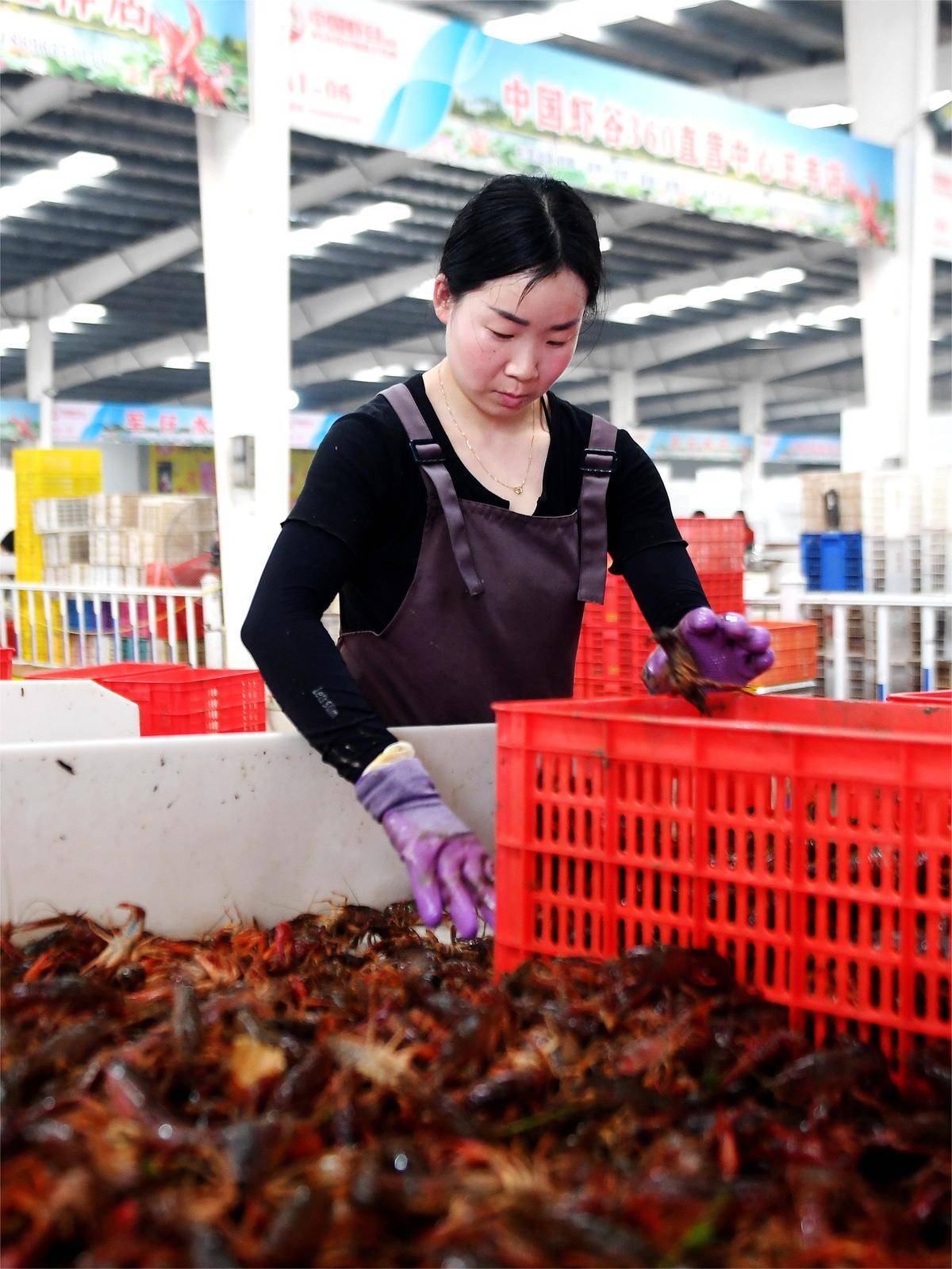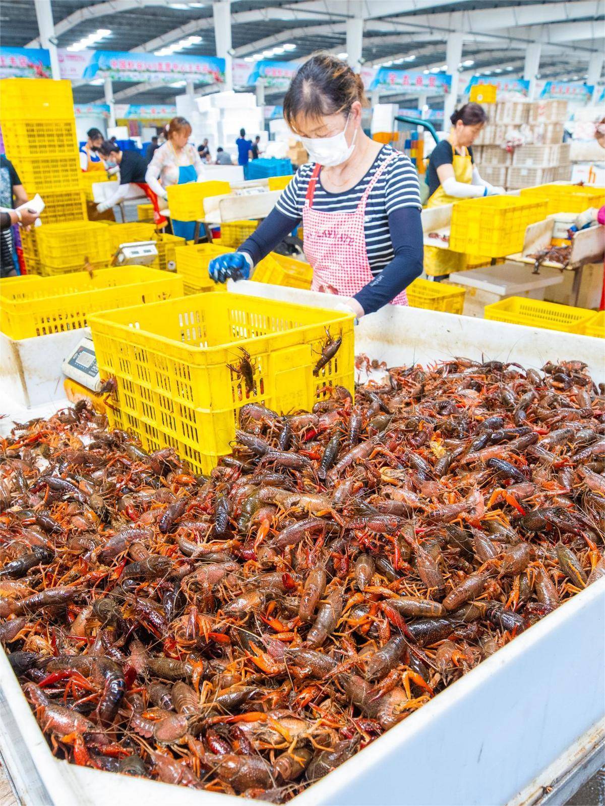 2022年5月6日,中国虾谷总部,工人在忙碌地分拣小龙虾。(湖北日报全媒记者 柯皓 摄)