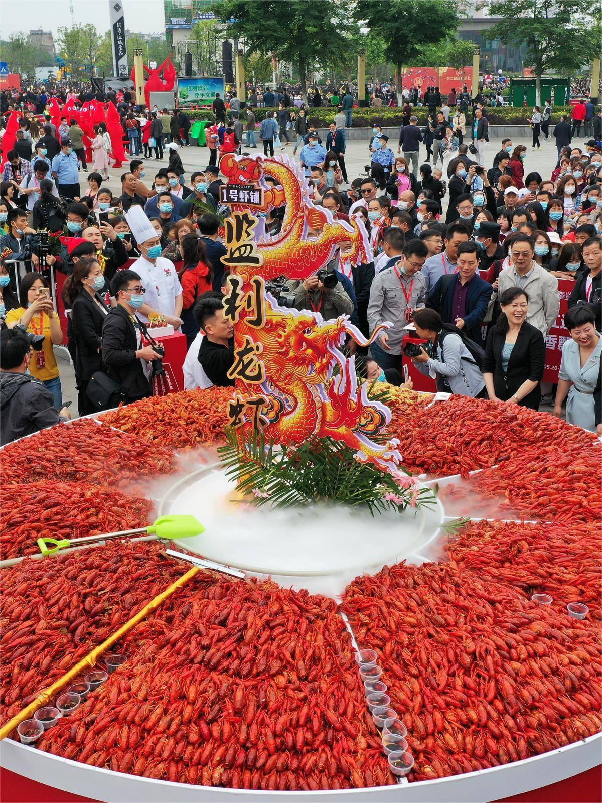 2021年5月20日,在监利市容城镇龙腾广场,活动主办主提前烹制了1000公斤小龙虾,免费分发给市民和游客品尝。(湖北日报全媒记者 陈勇 通讯员 宋丛峰 胡雪飞 摄)
