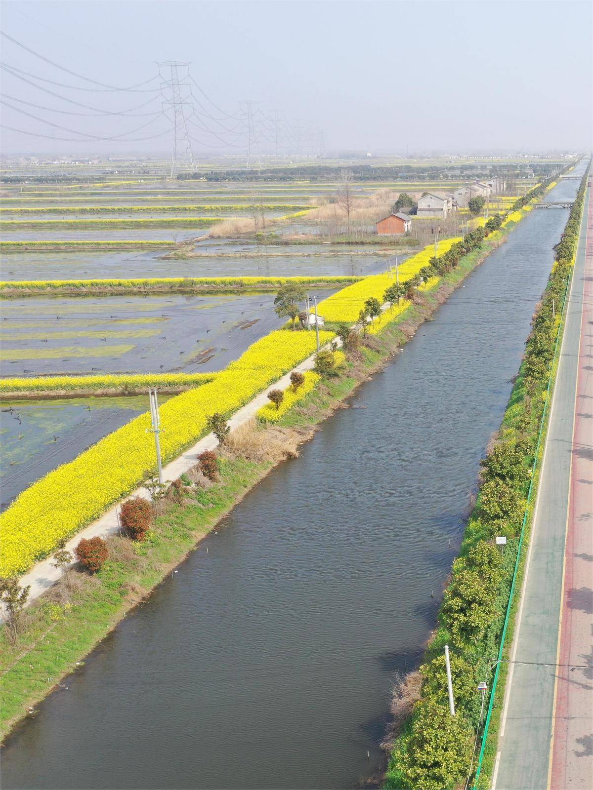 油菜花盛开在虾稻田边,形成一道独特的风景。(潜江市农业农村局提供)