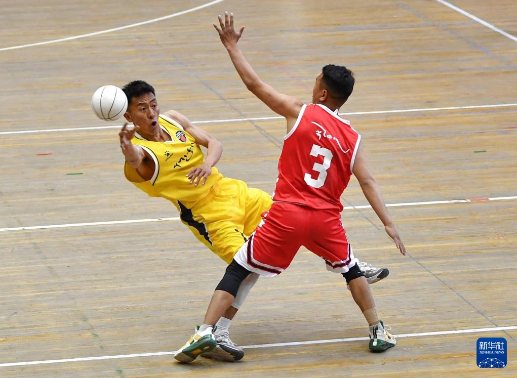 5月14日,那曲队次仁多吉(左)在比赛中传球。新华社记者 晋美多吉 摄