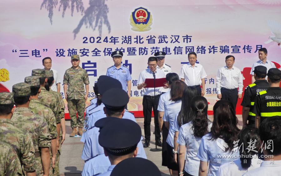 荆楚网(湖北日报网)讯(通讯员 谢安琪 王威)5月17日,世界电信日。当天上午,武汉市洪山广场电信营业厅门前,湖北省公安厅内保总队、武汉市公安局、武汉市通管局相关领导与120余名电信、移动、联通、广电、电力、铁塔等“三电”企业职工以及公安民警代表,参加了2024年湖北省武汉市“三电”设施安全保护暨防范电信网络诈骗宣传月启动仪式。