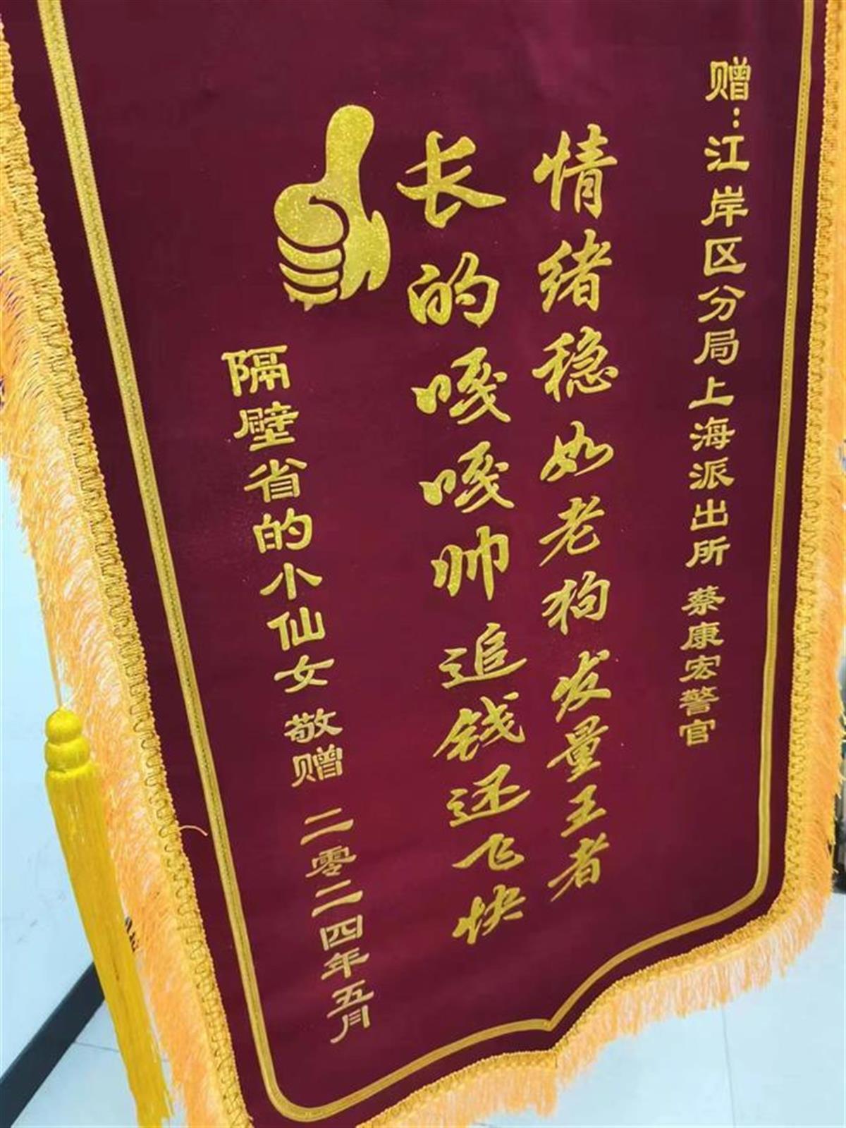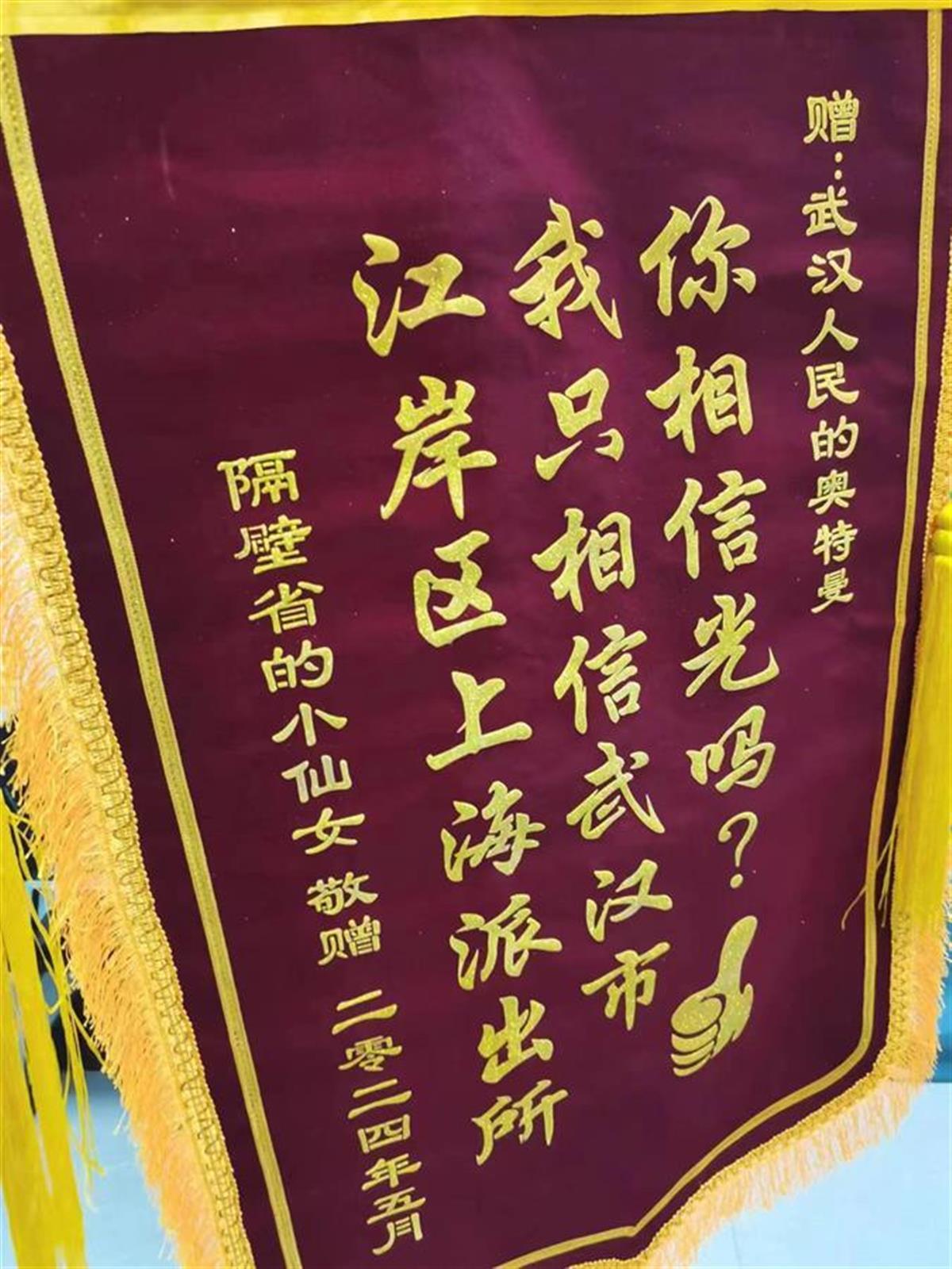 5月16日,武汉市公安局江岸区分局上海街派出所收到快递来的两面锦旗,一面锦旗写着:“你相信光吗?我只相信武汉市江岸区上海派出所”;另一面锦旗写着:“情绪稳如老狗 发量王者;长得嘎嘎帅 追钱还飞快”,两面锦旗的落款都是“隔壁省的小仙女敬赠”。