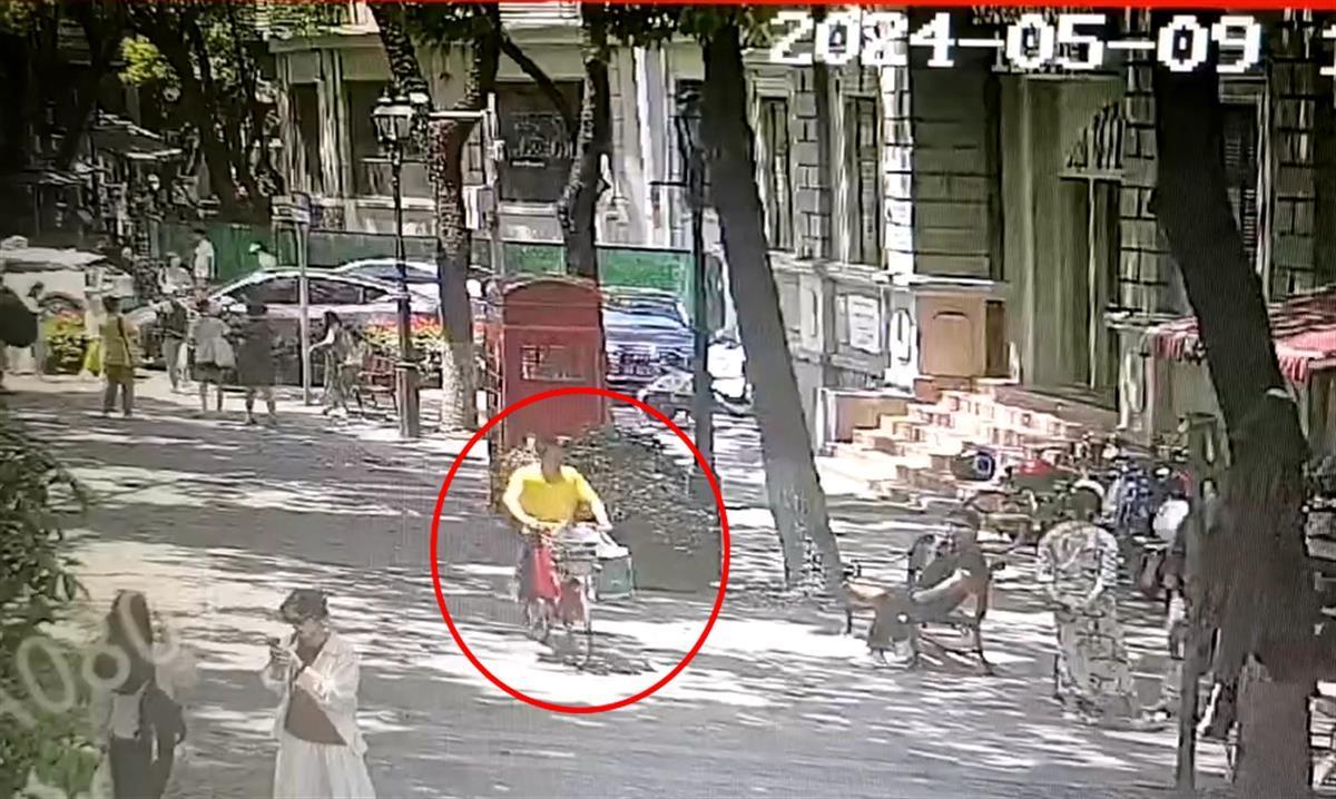 民警毕建军和辅警蔡康宏安慰她别着急,立即查看城市视频,在视频中看到,一名身穿黄色上衣的男子骑自行车经过,“捡”走这只包包,骑车穿过大智路,到了友益街,进入一条小巷。