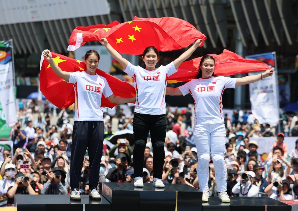 5月18日,亚军孙佳琪(左)、冠军孙思蓓(中)、季军邓雅文在颁奖仪式上庆祝。新华社记者 王楷焱 摄