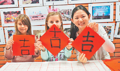 塞尔维亚诺维萨德大学孔子学院师生展示书法作品。 赵路航摄 |