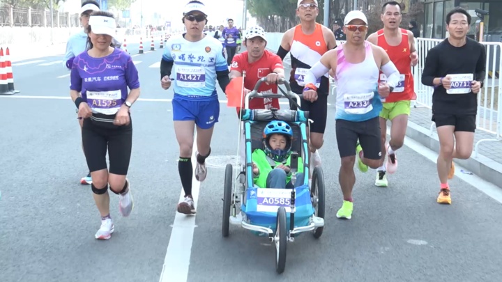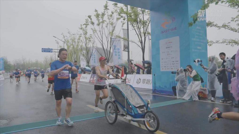 新华社南京5月19日电(记者何磊静、蒋文茜)在不久前江苏的一场马拉松赛尾声,只剩零星跑者还未抵达终点。这时,一位身形瘦弱的中年男子推着一辆蓝色童车向终点冲去,现场顿时沸腾起来,响起热烈欢呼和掌声,仿佛他们就是这场比赛的冠军。