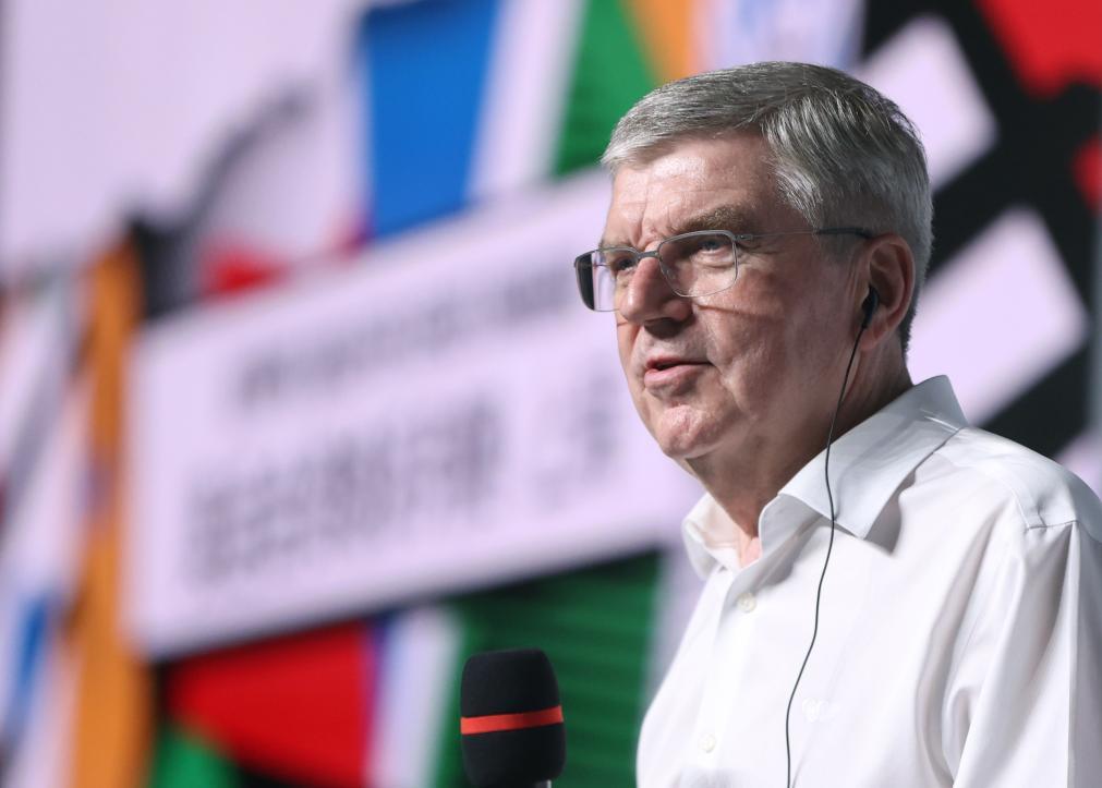 5月19日,国际奥委会主席巴赫在新闻中心回答记者提问。新华社记者 贾浩成 摄