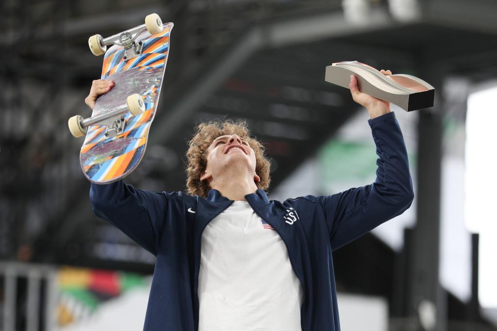 5月19日,美国选手贾格尔·伊顿在男子碗池颁奖仪式上庆祝。新华社记者 许雅楠 摄