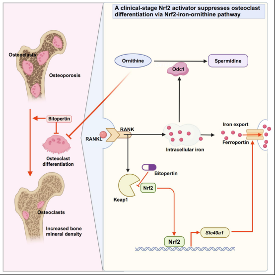 李锋教授团队此项研究发现,新型Nrf2激活剂Bitopertin能够通过上调Slc40a1基因(编码铁转运蛋白)的表达来促进铁外排,从而降低细胞内的铁水平。细胞内铁水平是破骨细胞分化和功能的关键因素,其含量在破骨细胞分化的过程中升高。通过降低铁水平,Bitopertin能够有效地抑制破骨细胞的分化,从而减少骨质疏松症的发生。