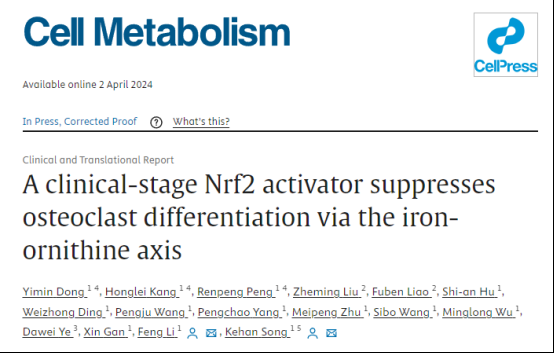 荆楚网(湖北日报网)讯(记者 毛易媛 通讯员 谢雪娇)近日,华中科技大学同济医学院附属同济医院骨科李锋教授团队通过近6年的研究发现一款新的临床阶段的Nrf2激活剂Bitopertin,该激活剂能够通过抑制破骨细胞分化而缓解骨质疏松。该研究不仅为骨质疏松症的治疗提供了新的视角,而且可能对其他与铁代谢紊乱相关的疾病产生深远影响。该成果近期发表在国际权威期刊《细胞代谢》(《Cell Metabolism》)上。同时,团队还基于该研究成果申请了一项国家发明专利,积极推动研究成果的临床转化。