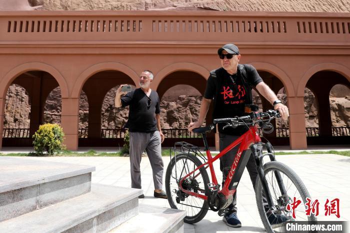 中新网记者18日在延安市志丹县见到了柯立思与福尔克,此时的他们正准备前往刘志丹烈士陵园与保安革命旧址参观。柯立思身穿黑色T恤,上面印有“长征”二字。福尔克指着略带泥泞的助力自行车告诉福尔克:“车胎外侧破了,必须尽快修理,电瓶也不行了。”