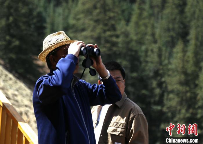 图为游客拿望远镜欣赏自然风光。张海雯摄