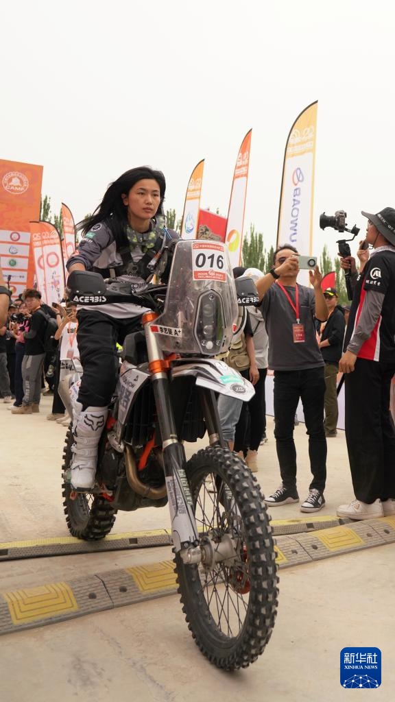 5月20日,远离公路车队车手李艺斐驾驶摩托车驶过发车台。新华社记者 张啸诚 摄