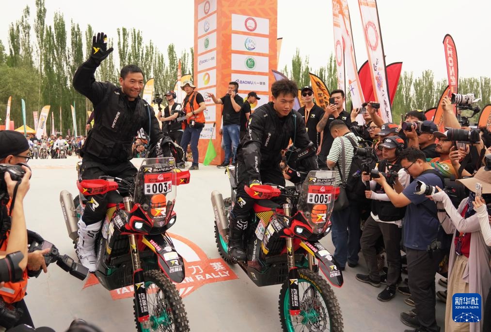 5月20日,西普森拉力车队车手方明集(左)和儿子方响量驾驶赛车驶过发车台。新华社记者 张啸诚 摄