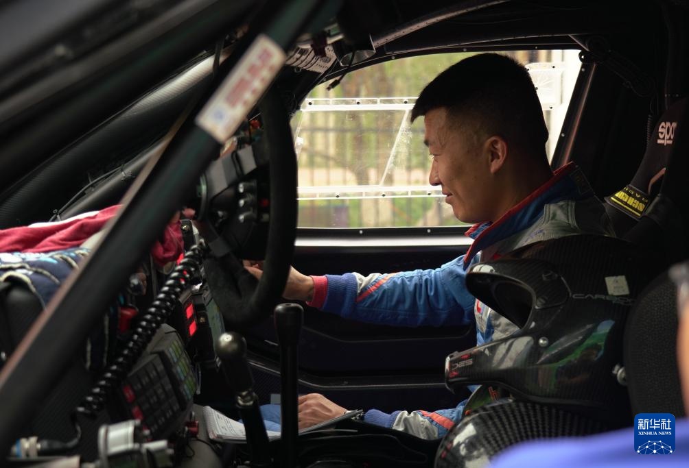 5月20日,河北迁安九江汽摩运动俱乐部领航员田雷在发车前调试赛车。新华社记者 张啸诚 摄