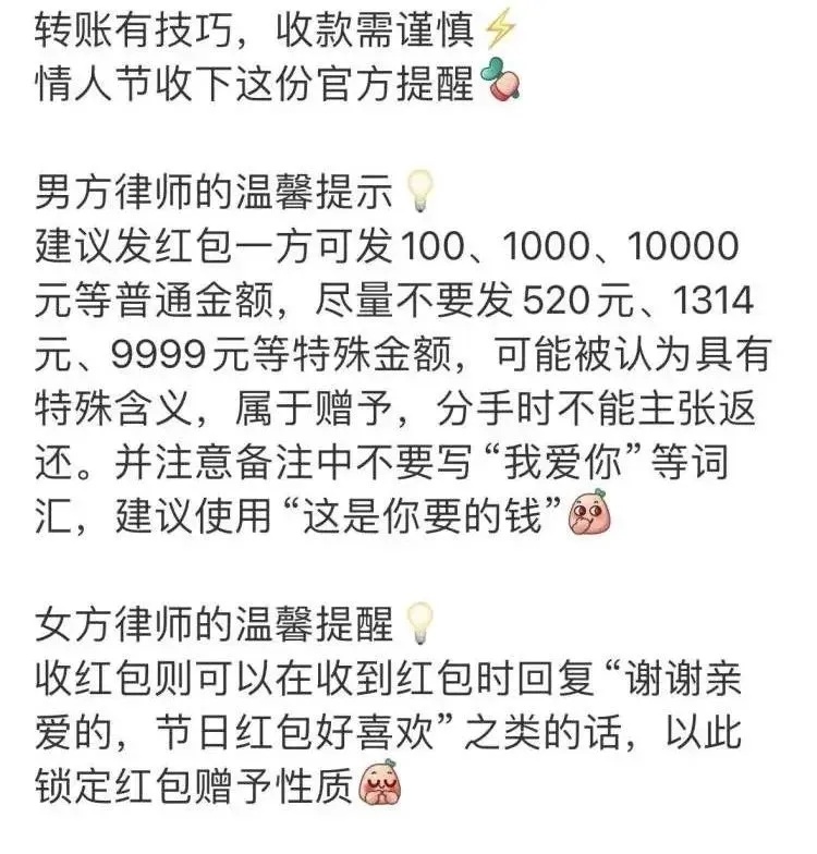 此外,记者注意到,有不少网友在社交媒体上支招:“不管收到多少转账,都可以回复对方‘谢谢宝贝的节日红包’之类的话,这样就可以锁定对方的红包赠与性质。”对于这种说法,律师对此如何看待?