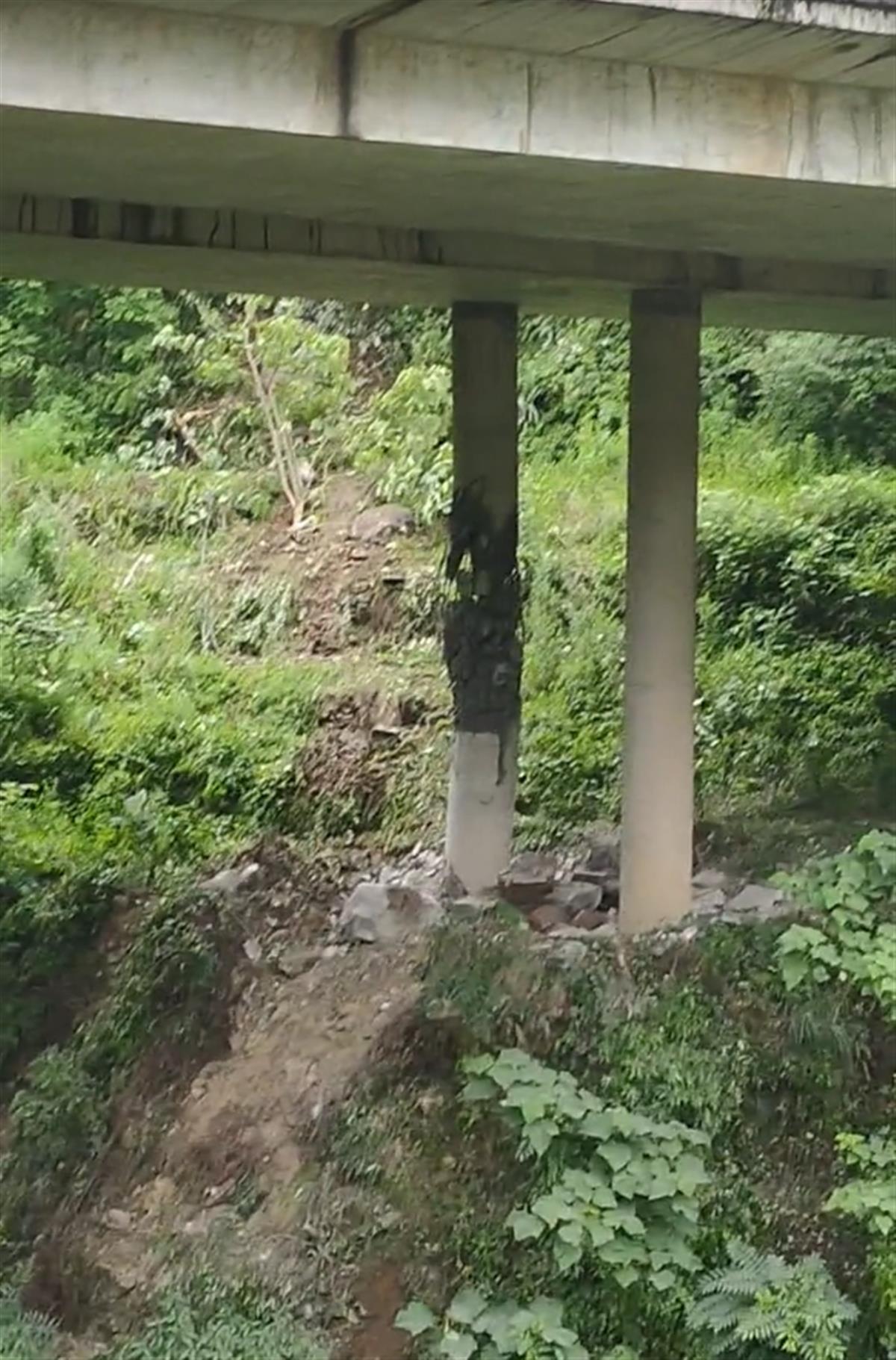 该网友告诉极目新闻记者,21日早晨,他驾车准备经行G65包茂高速渝湘段的时候,发现该路段已实施管制,他只好改走319国道。当日上午10时许,他在国道上经过G65包茂高速渝湘段阿蓬江收费站附近时看到,一根高速公路桥墩受损严重,听说是被山上滚落的石头砸中所致。