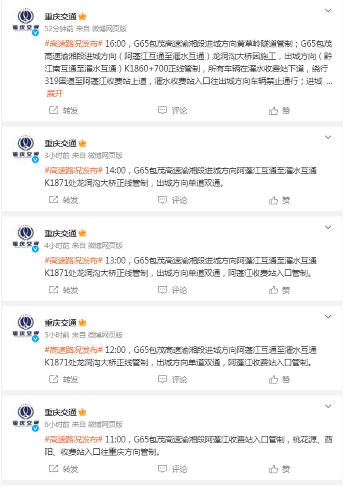 5月21日上午11时许,重庆市交通运输委员会官方微博“重庆交通”发布了一条高速路口信息:“11:00,G65包茂高速渝湘段阿蓬江收费站入口管制,桃花源、酉阳收费站入口往重庆方向管制。”12时,该微博又发布了一条高速路口信息:“12:00,G65包茂高速渝湘段进城方向阿蓬江互通至濯水互通K1871处龙洞沟大桥正线管制,出城方向单道双通,阿蓬江收费站入口管制。”此后的数小时,该微博又接连发布了四条和G65包茂高速渝湘段有关的交通管制信息。