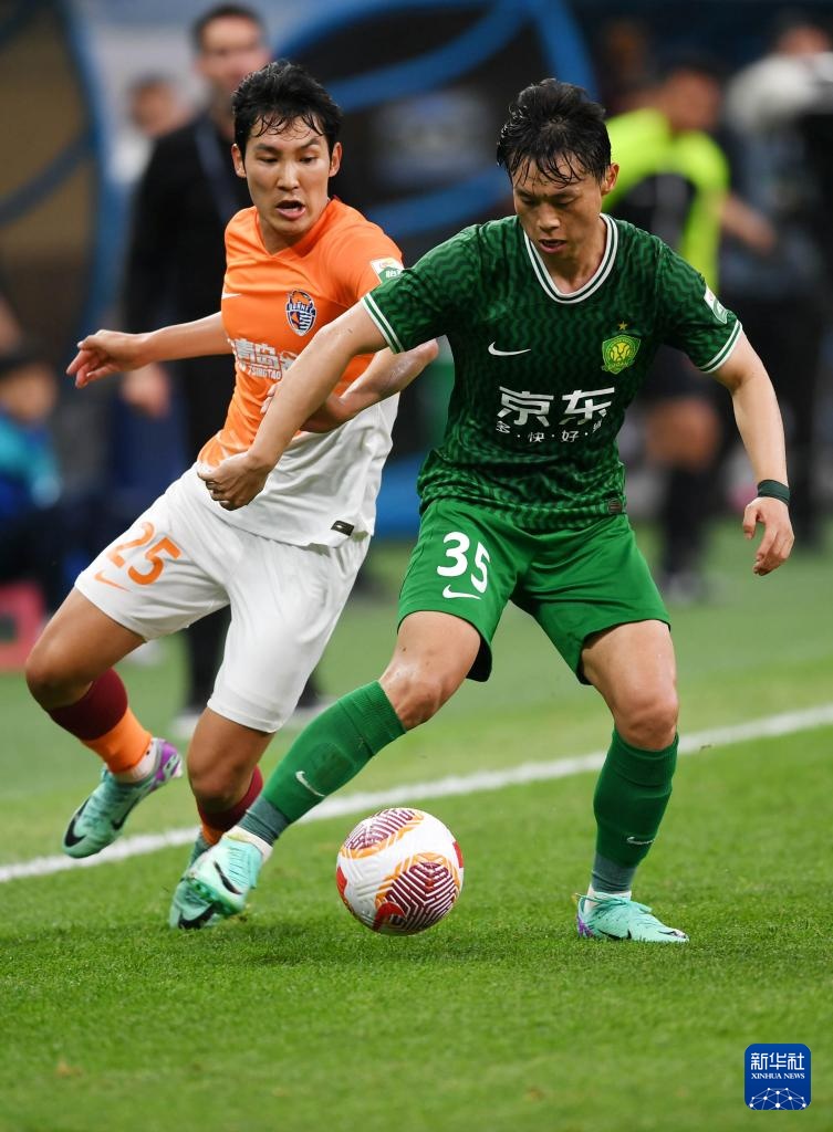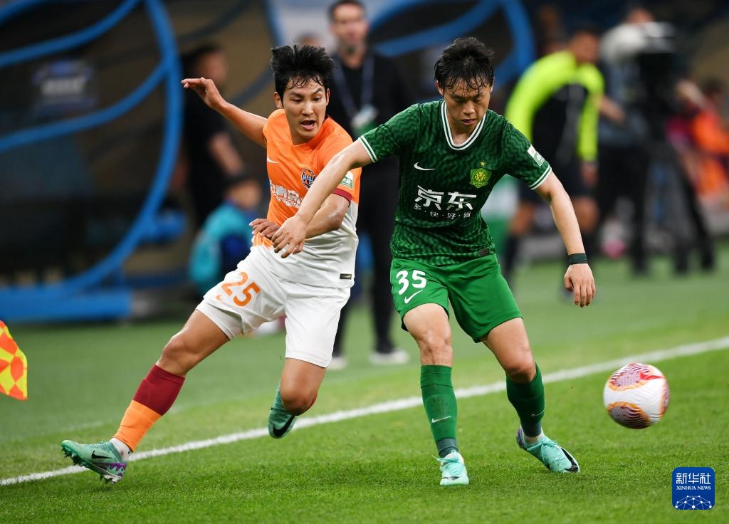 5月21日,青岛海牛队球员王建明(左)在比赛中与北京国安队球员江文豪拼抢。新华社记者 李紫恒 摄