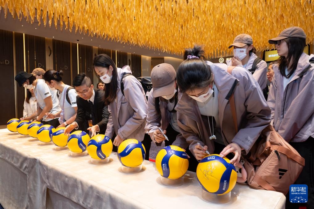 5月21日,中国女排队员在欢迎仪式上签名。新华社记者 张金加 摄